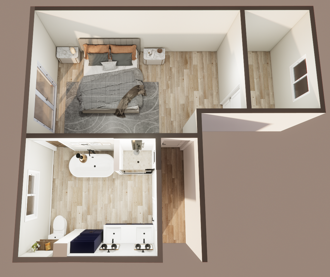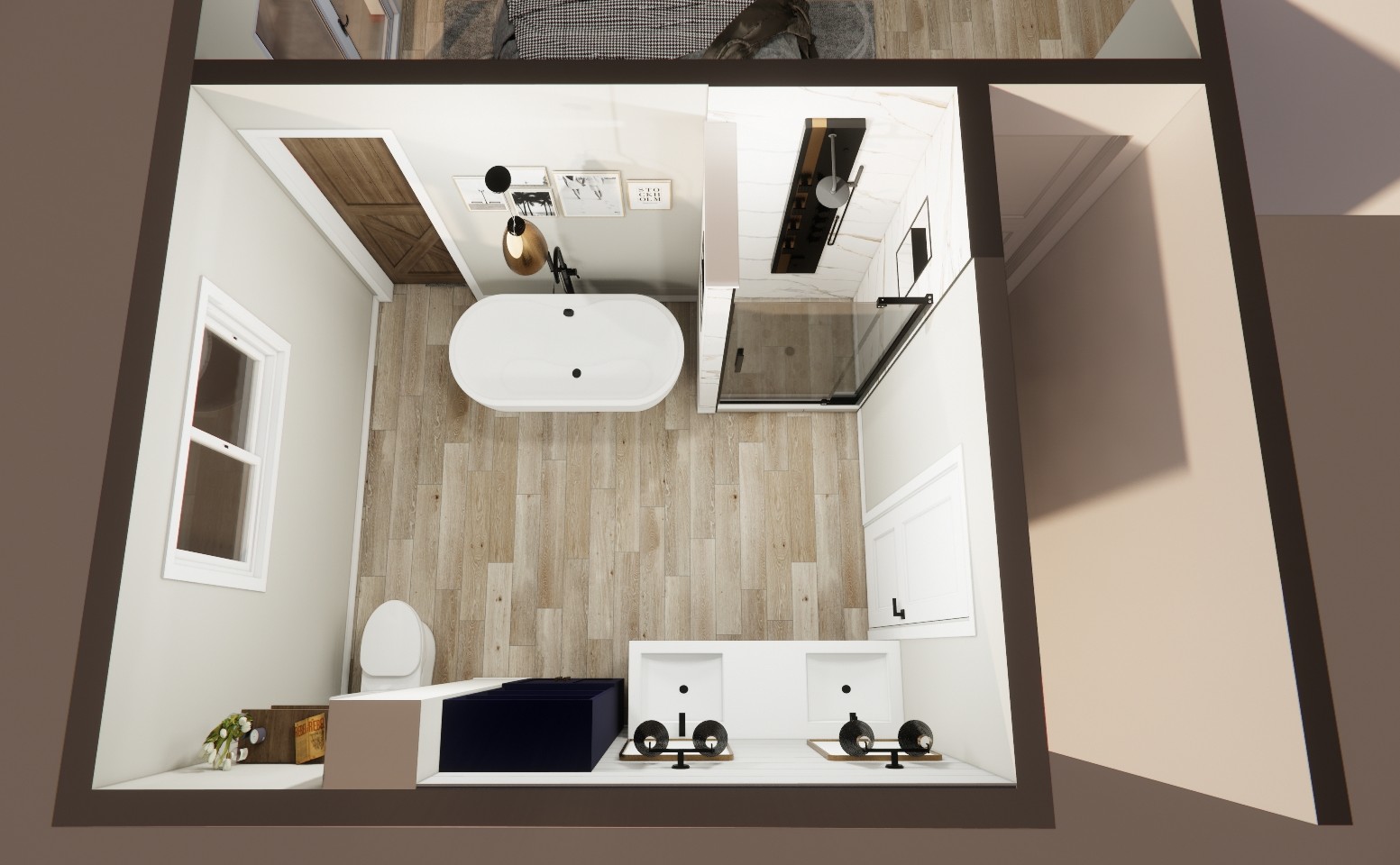 We started by opening up and restructuring the space, coordinating full design, permitting, and inspections so everything behind the walls was done right. The new ensuite features large-format polished porcelain wall tile, a custom tiled shower with marble hexagon floor, and a sleek matte black Moen shower system. A freestanding soaker tub, updated vanity with framed mirror, and carefully selected lighting give the room a boutique–hotel feel while staying practical for everyday use.
