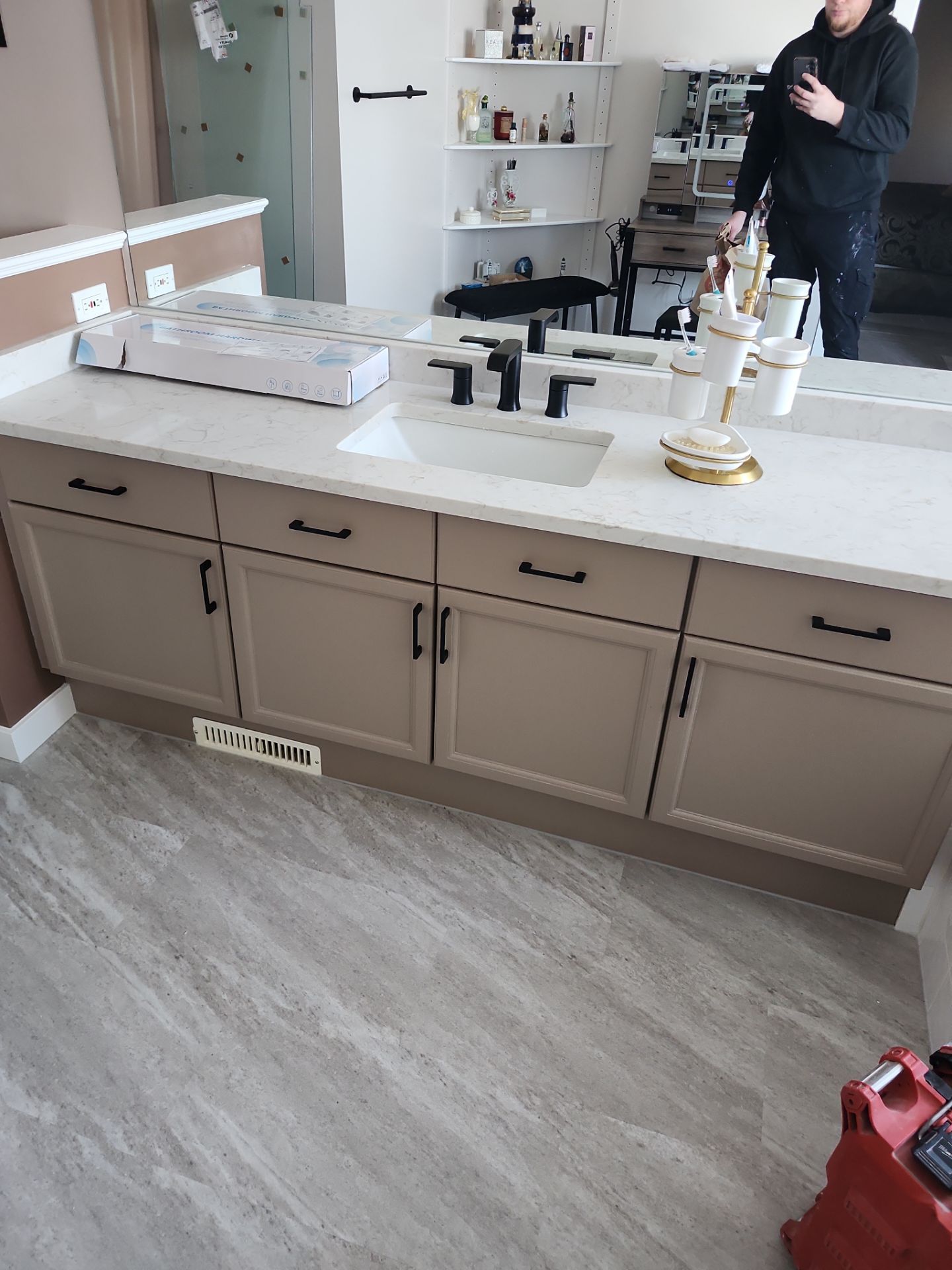 - New 12” x 24” luxury vinyl tile flooring in Cashmere Beige Granite