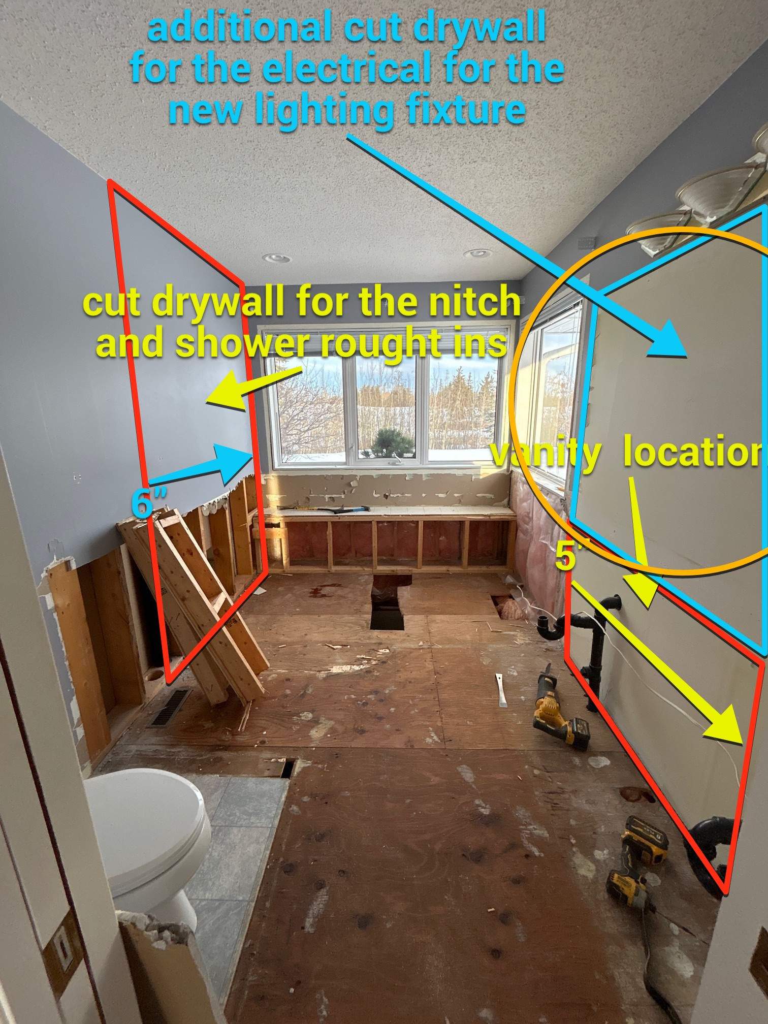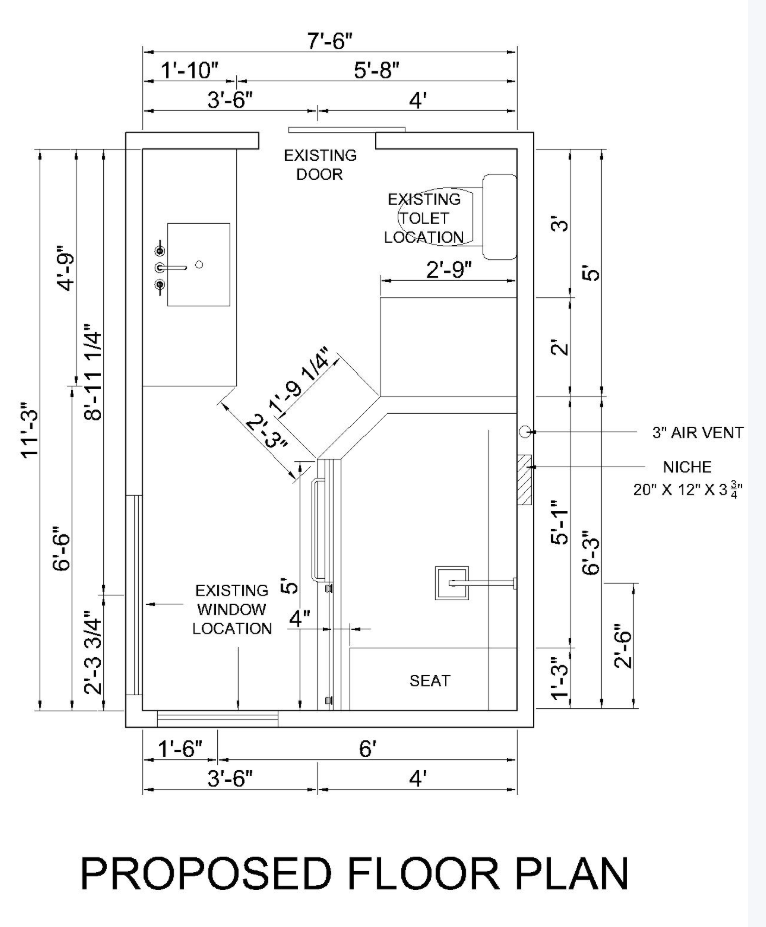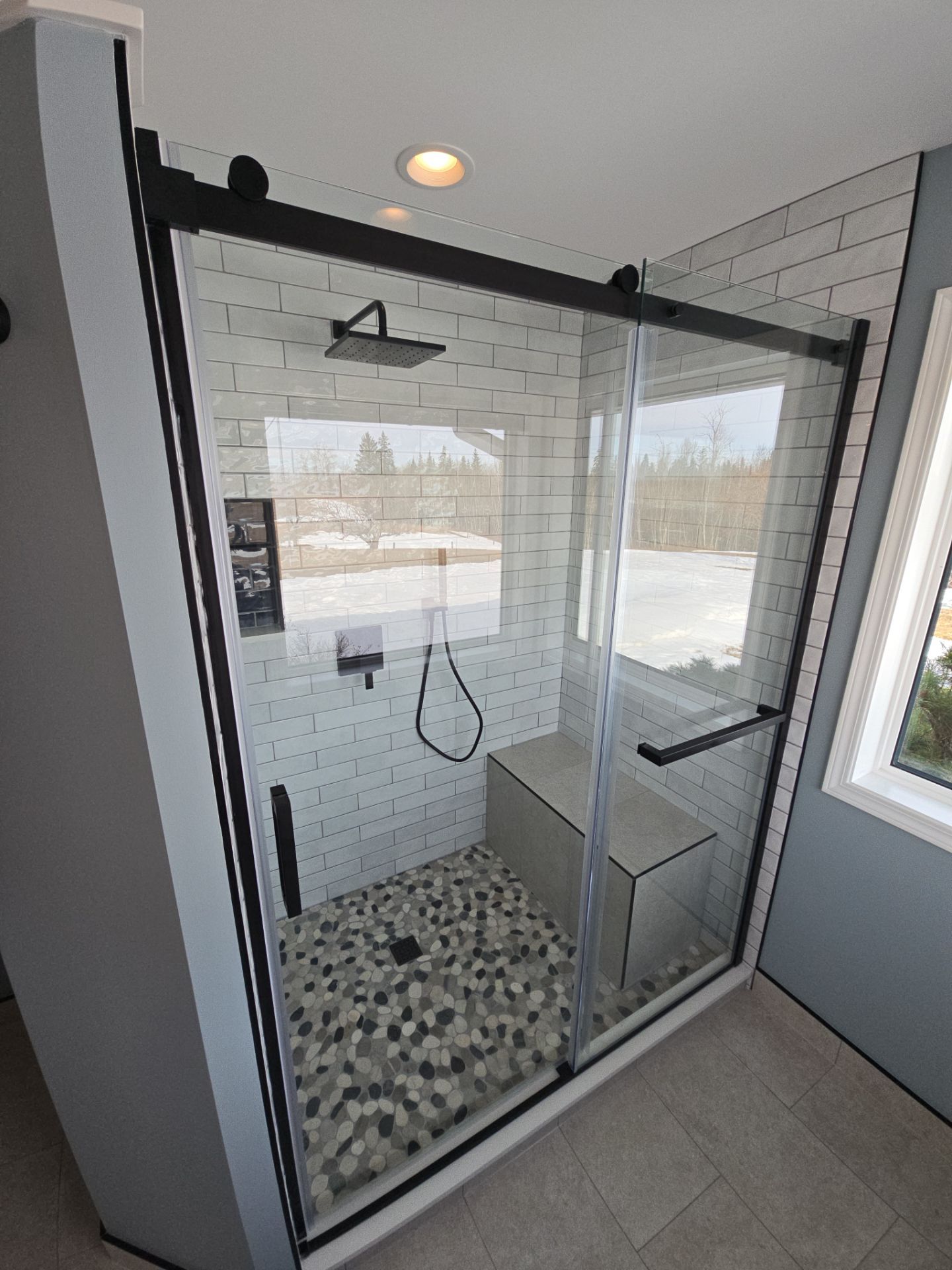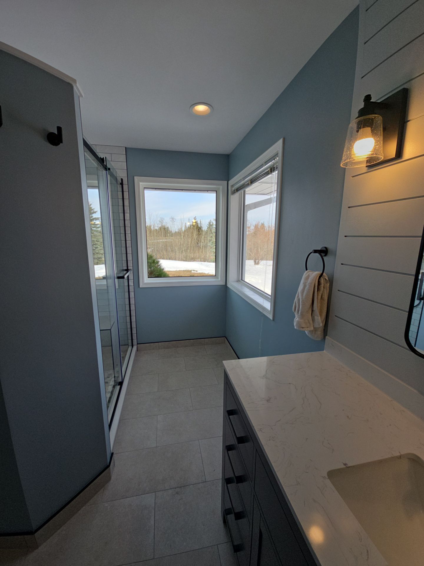 This renovation features a 4′ x 6′ custom tiled shower with full waterproofing, proper backer board, and a complete Schluter system behind the scenes. We added a quartz-capped bench and niche, tiled curb, and carefully detailed transitions so the shower performs as good as it looks. A new window was installed in the shower area and reframed to suit the layout, complete with proper insulation and exterior detailing.