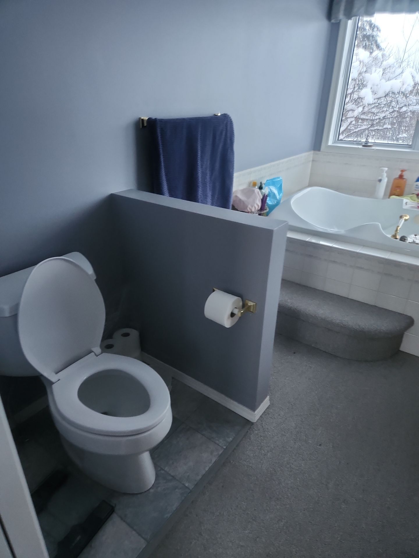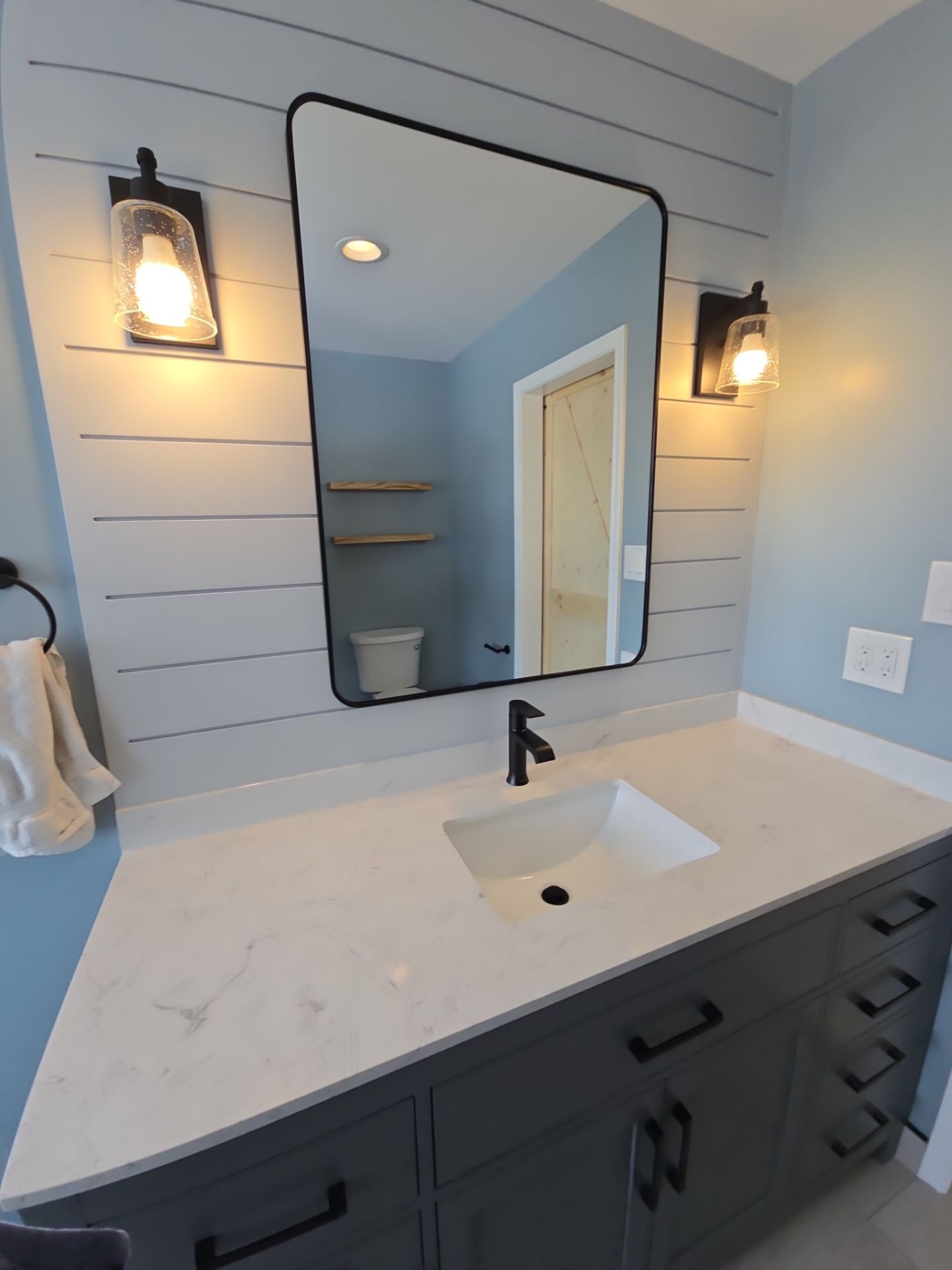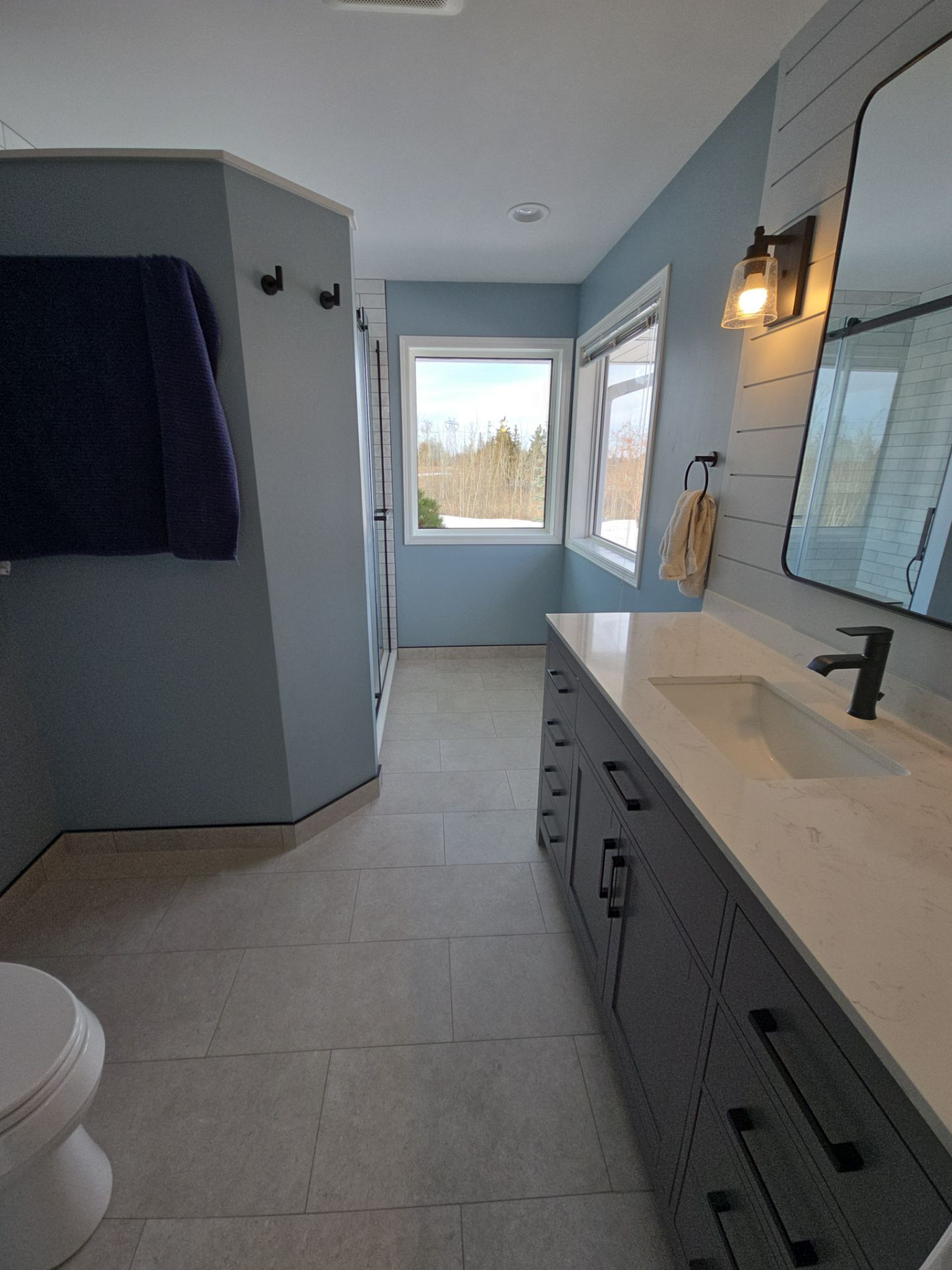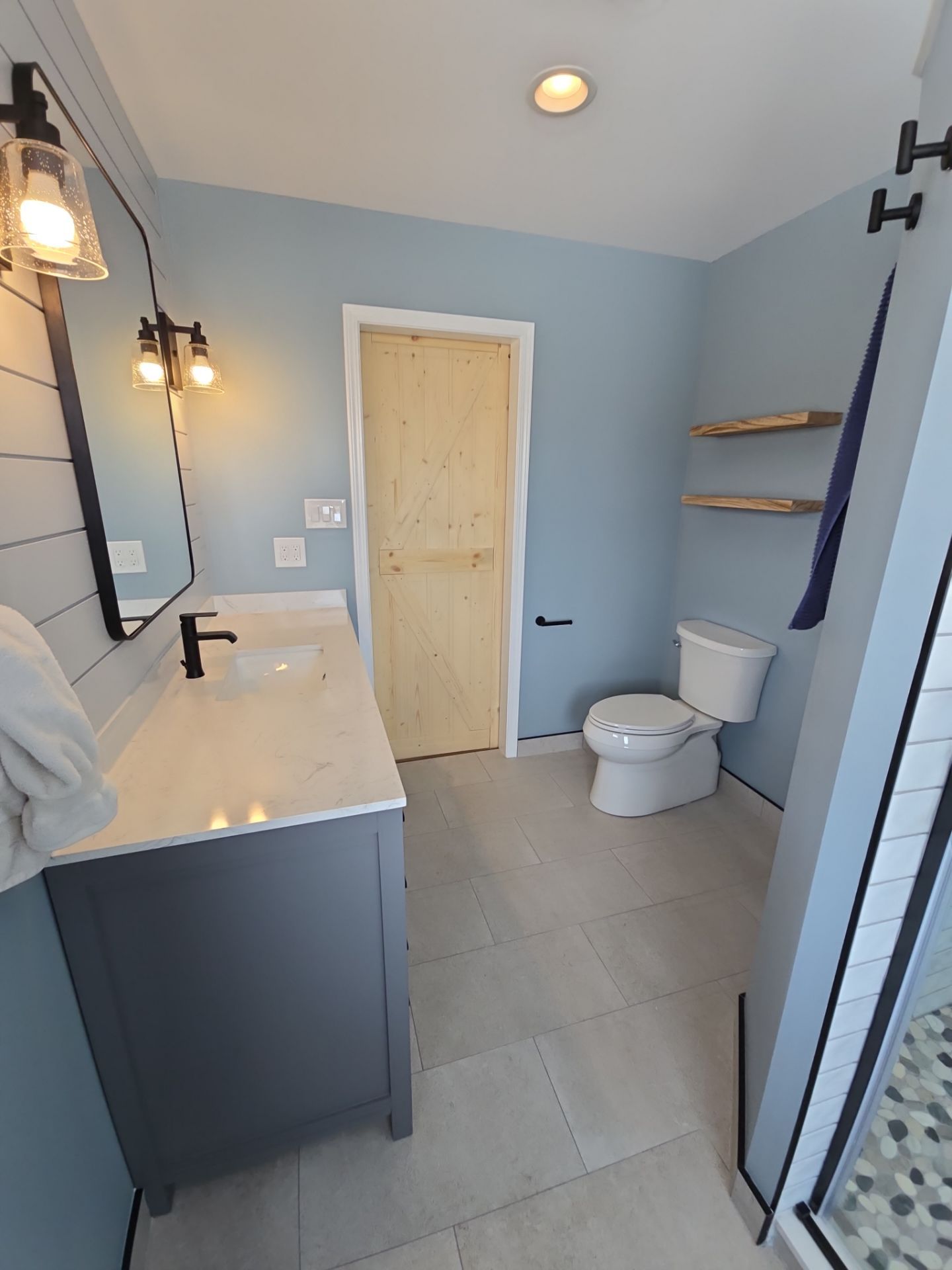 The rest of the space was rebuilt around function and finish quality: a new vanity with quartz countertop, sink, and faucet, updated toilet and tile flooring, and tiled baseboards and transitions for a clean, low-maintenance edge. We upgraded the bath fan and ducting for better ventilation, added energy-efficient lighting and switching, and brought all plumbing and electrical up to current code.